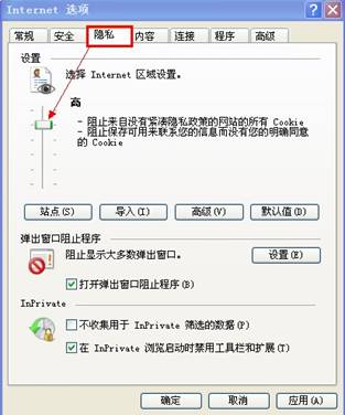 (1)浏览器隐私级别过高即会导致此问题,请您按照下图检查浏览器的隐私级别是否设置为“高级”或者“阻止所有Cookie”,将隐私级别降为高级以下,确定之后重启浏览器测试即可;