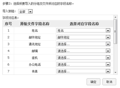 3.保存完成后,即可以在263邮箱的通讯录中,导入此文件。导入时,需要选择文件字段的对应名称,其中姓名和邮件地址是必选项。选择完成后,点击确定即可完成导入。