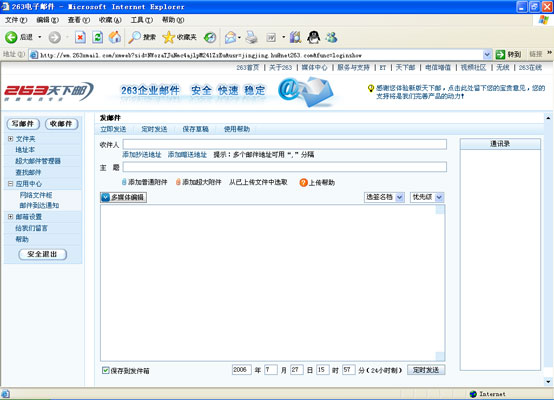 、编写邮件正文、主题,填写收件人地址(可点击页面右侧的通讯录,选取联系人地址);点击"立即发送",系统会将邮件正文和下载文件的链接发给收件人,点击链接即可下载文件。注意:文件保存时间为7天,过期删除,以文件完整上传的最后时间开始计算。