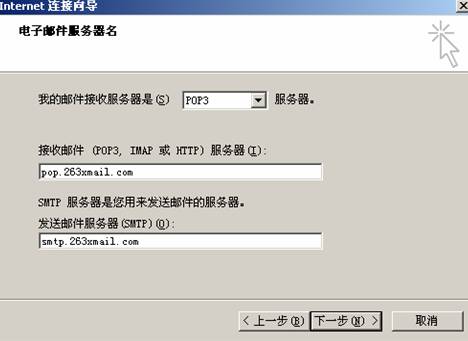 填写"接收邮件服务器"和"发送邮件服务器",这里以263xmail.com为例,实际情况请咨询您公司的系统管理员或者您的邮件服务提供商。填写完毕,点击下一步,则进入如下对话框: